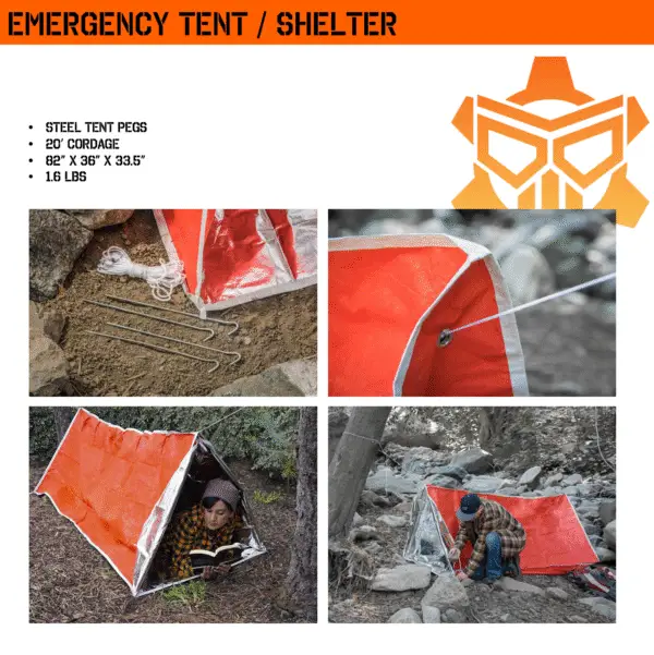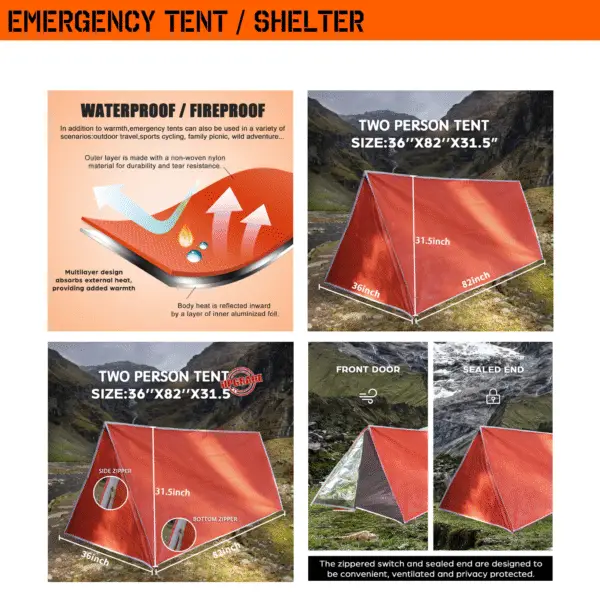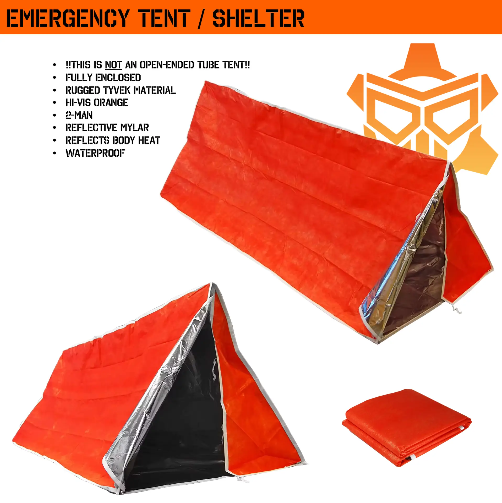Be prepared for any emergency with this LIMA-TANGO orange emergency shelter. It can accommodate two people and features one door for easy entrance. The tent is made of durable nylon TYVEK material and reflective mylar. This portable and lightweight tent is perfect for hiking, camping, emergency, survival, and outdoor activities. It comes with waterproof feature, and wind protection to keep you safe in any weather. The heavy-duty design ensures that it can withstand any weather conditions. This tent is a must-have for any emergency preparedness kit. Add-on to your other LIMA-TANGO Survival Kits.