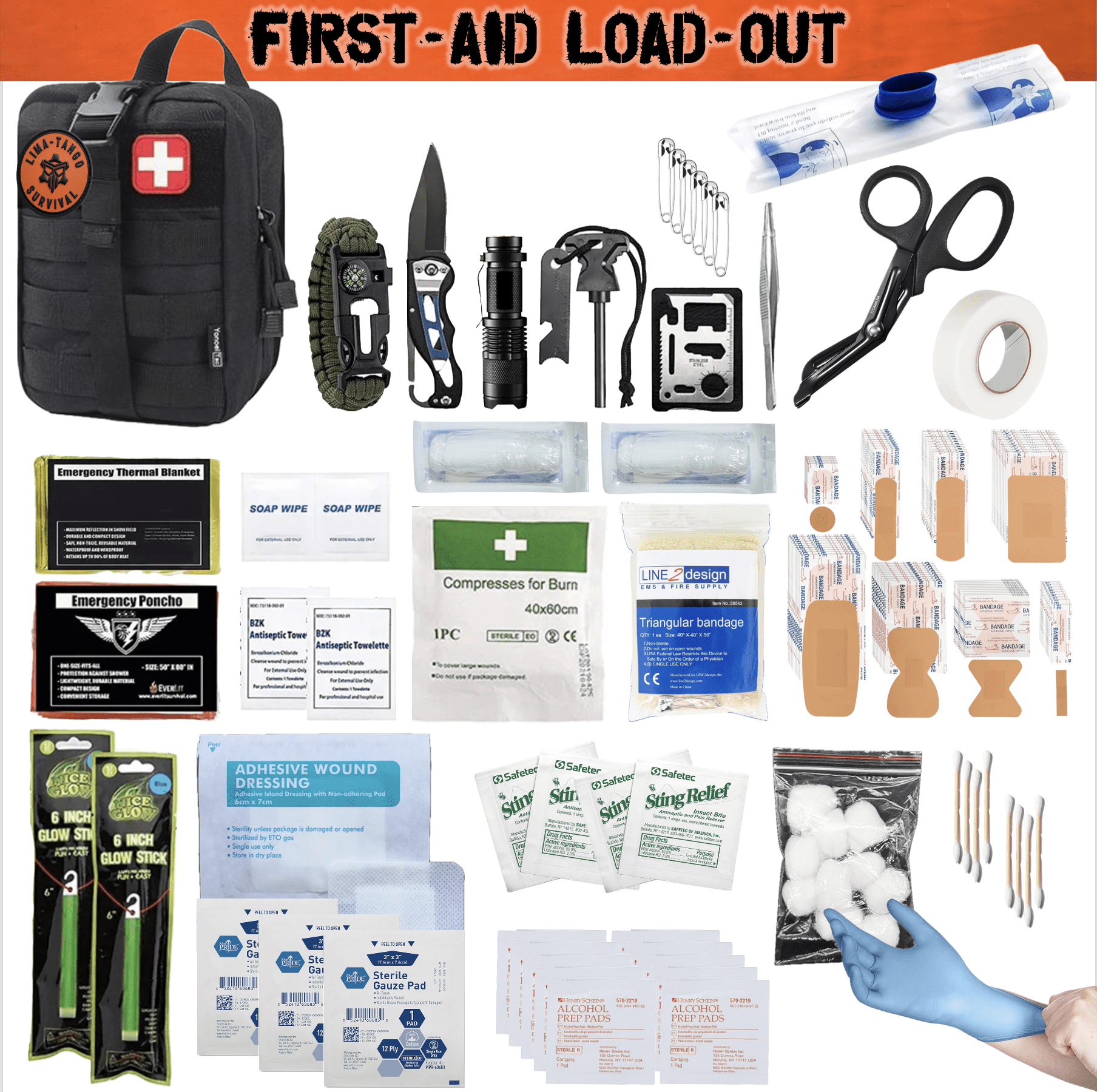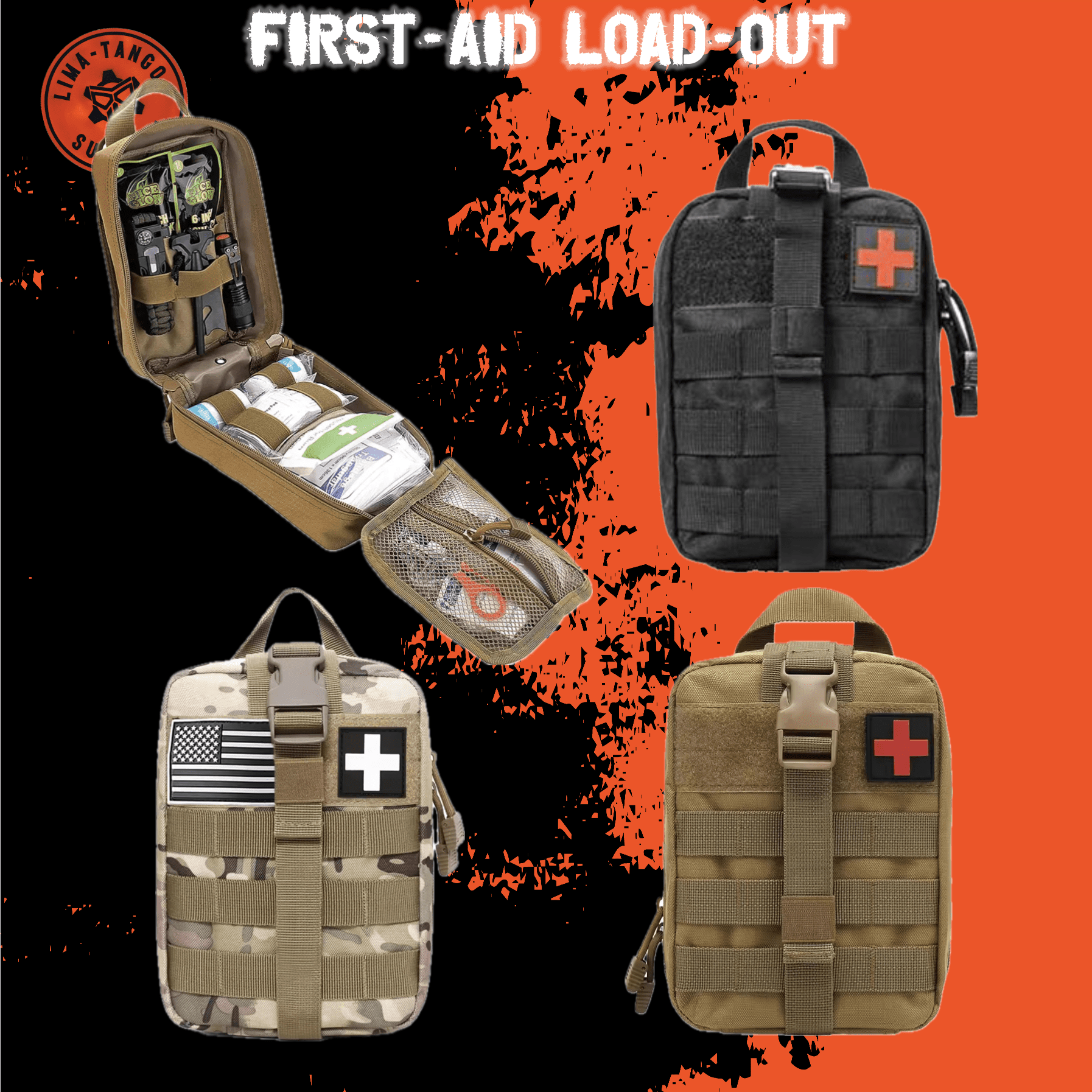 Molle pouch FIRST-AID | EDC (Every Day Carry) kit for survival, camping, hiking, hunting, and travel. The kit features a variety of pockets and compartments to store all the essential kit. The LIMA-TANGO brand is known for its quality and durability, making this kit a reliable option for any outdoor adventure or emergency scenario. Its compact size and lightweight design make it easy to carry. This is a must have for home and auto. Essentials needed for every day boo-boos.