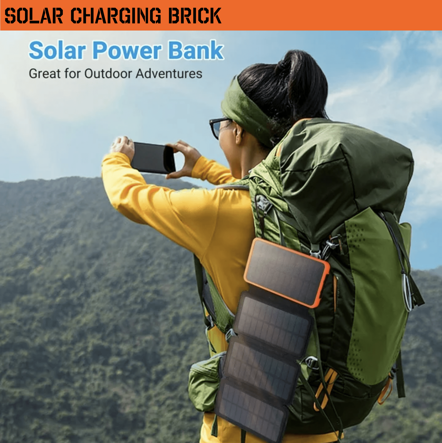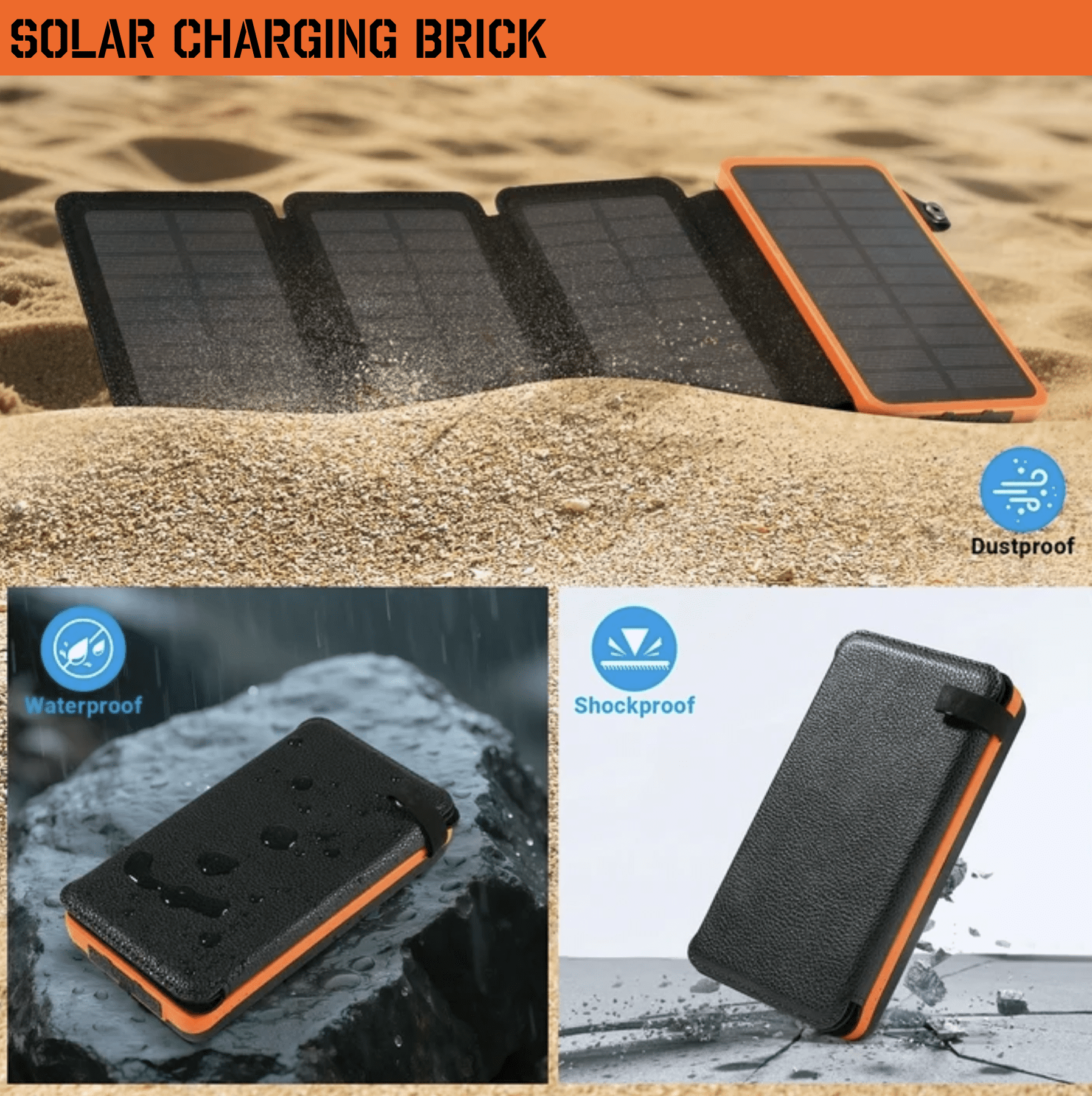 20000 mAh Solar Charging Brick. 4 Panel for iPhone, Android, iPad, Flashlight for Camping, Hiking, Emergency, Hunting and Travel. Orange and Black