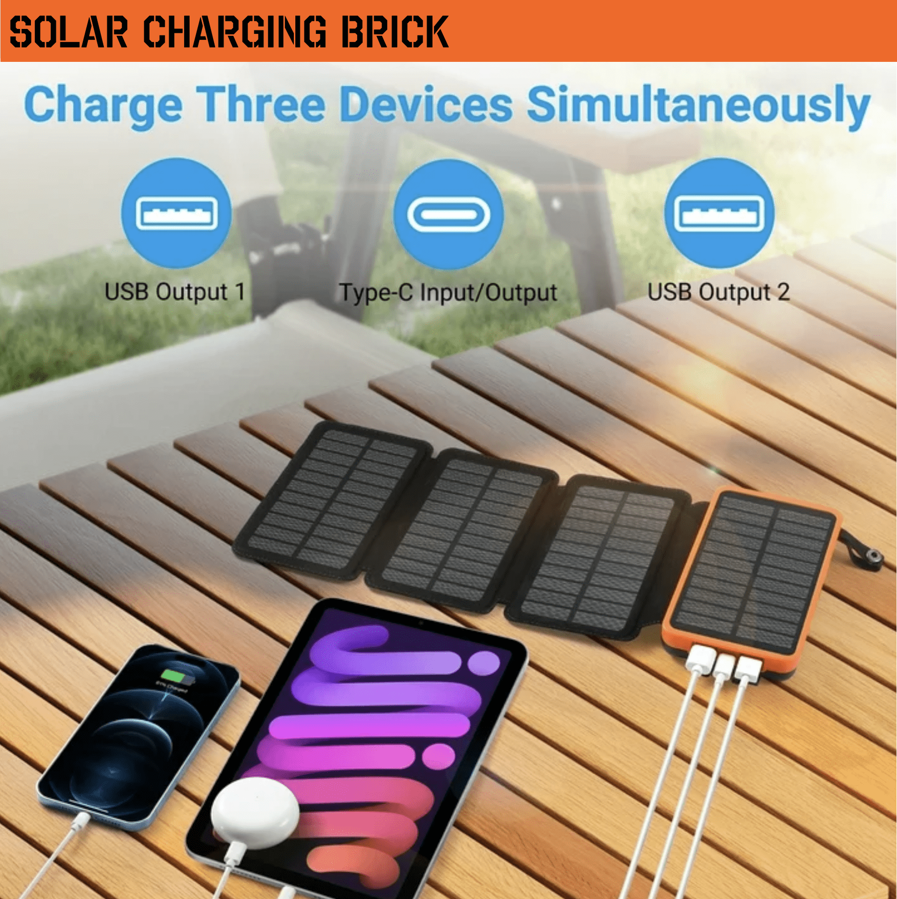 • This solar charger comes with two USB ports, allowing you to charge two devices simultaneously. It’s perfect for phones, tablets, and other electronic devices, making it ideal for family use or travel, saving you time.