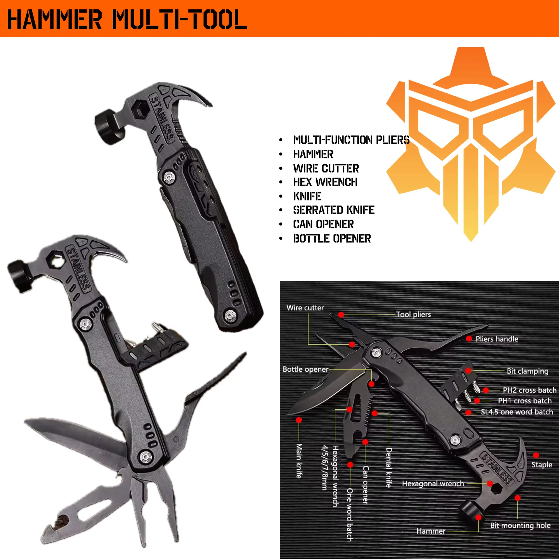 This professional Tactical Hammer Tool is a must-have for hikers, campers or emergency scenarios. This multi-tool contains: