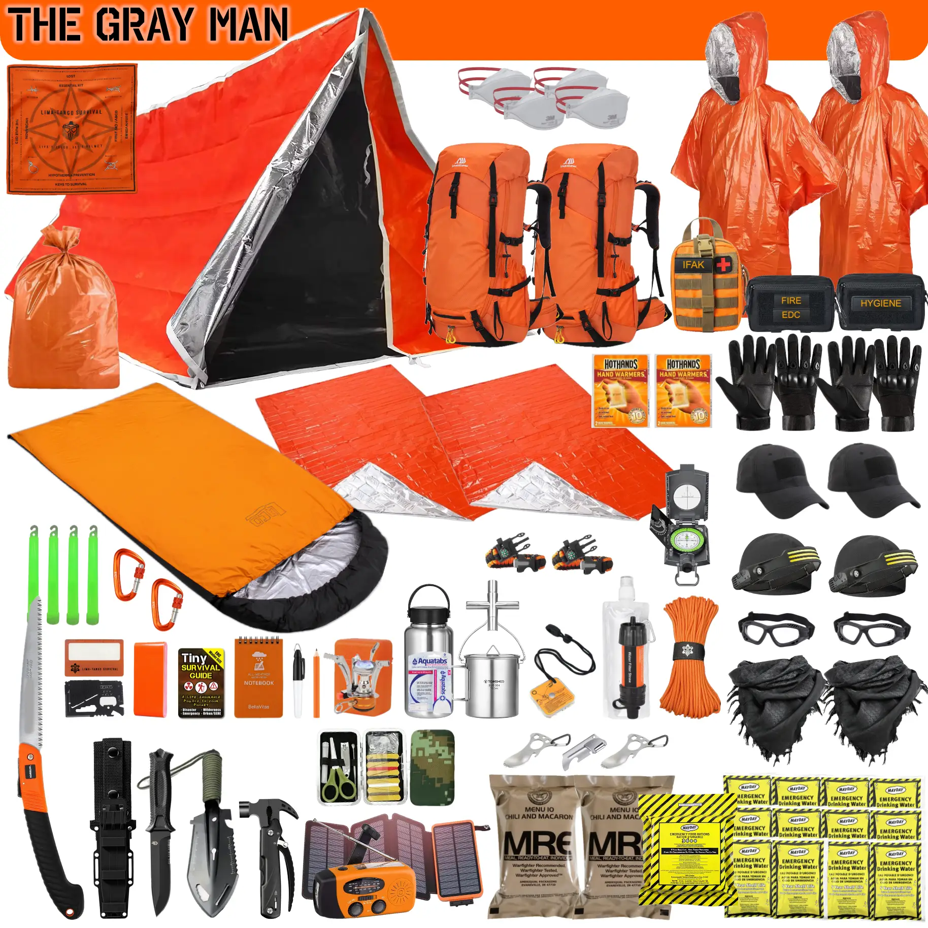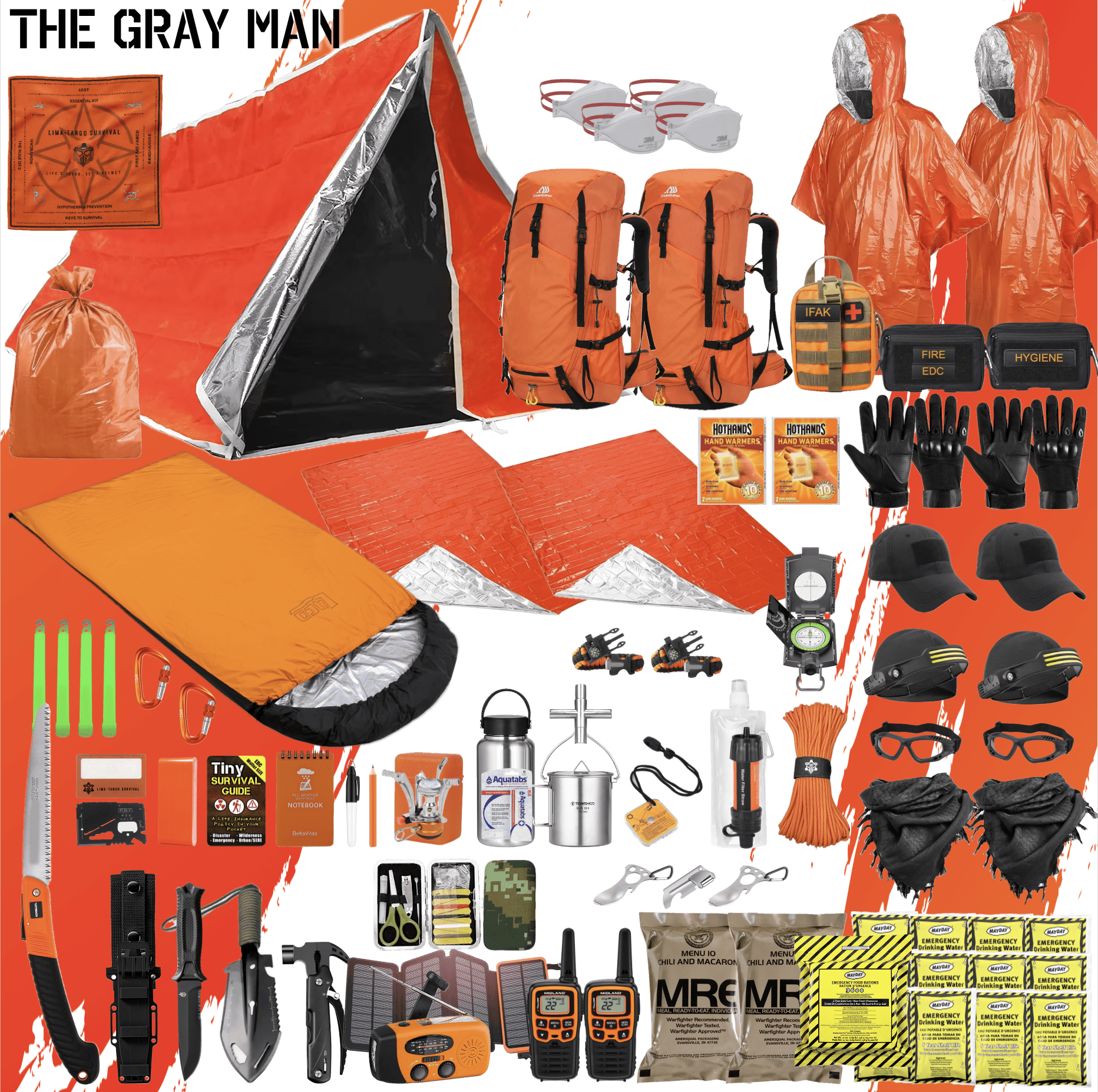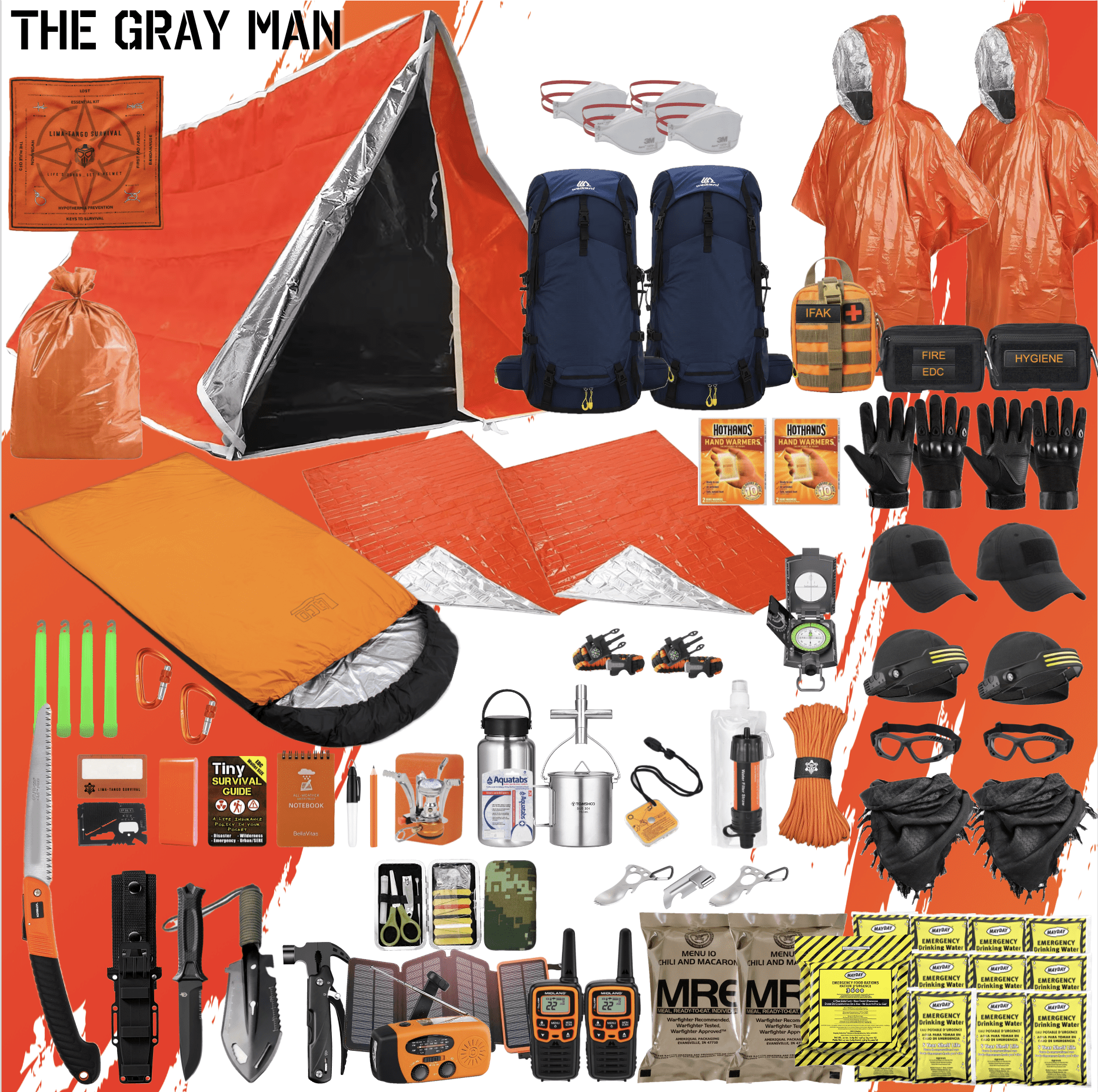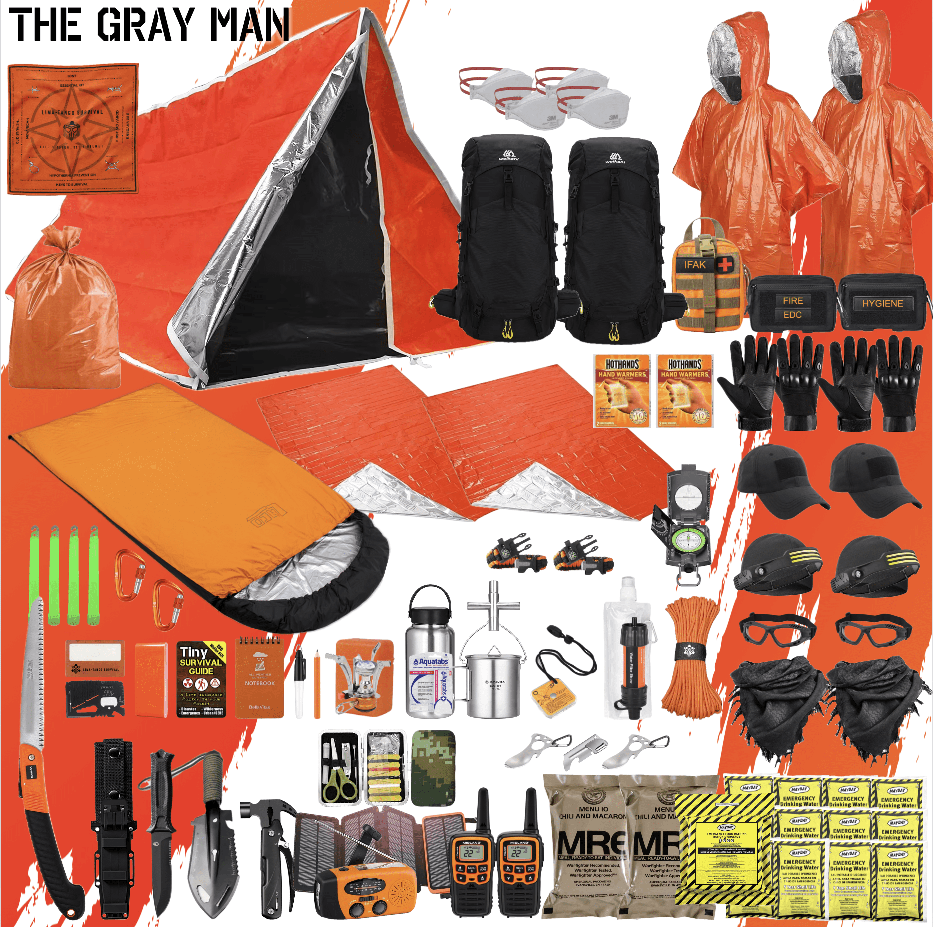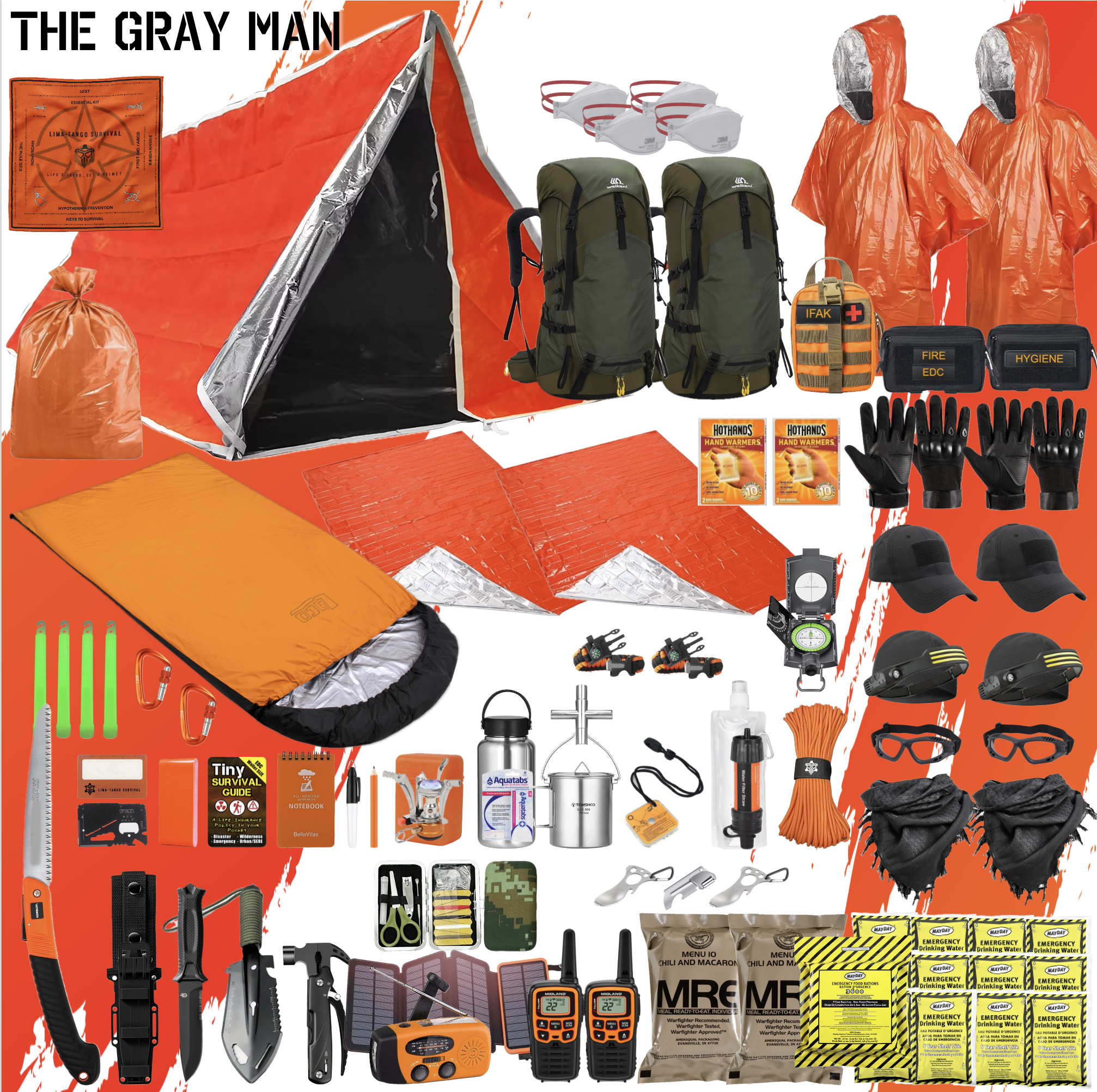Introducing THE GRAY MAN, our premier survival kit designed for a two-man team facing extreme conditions. With the same load-out as our popular ALPHA kit, this is designed to blend into the crowd. With a 50L sport | hiking backpack, you can be less conspicuous for operations in a non-permissive bug-out scenario. Perfect for long term, worst case, bug-out and get-home scenarios, this kit ensures you’re prepared for 72+ hours of survival. With high-end, reusable gear, THE GRAY MAN is your ultimate solution for any survival, emergency, or tactical situation.