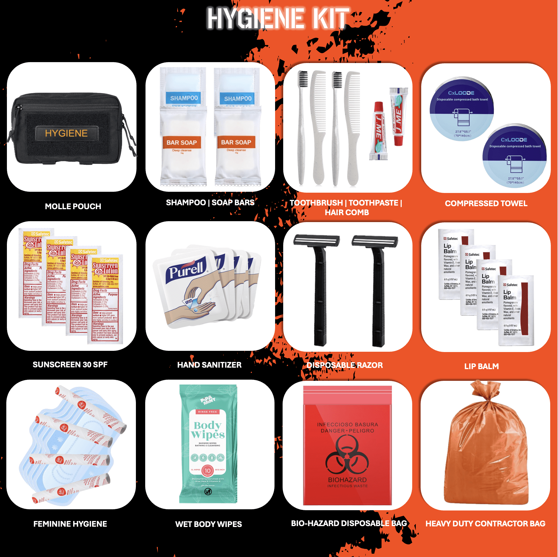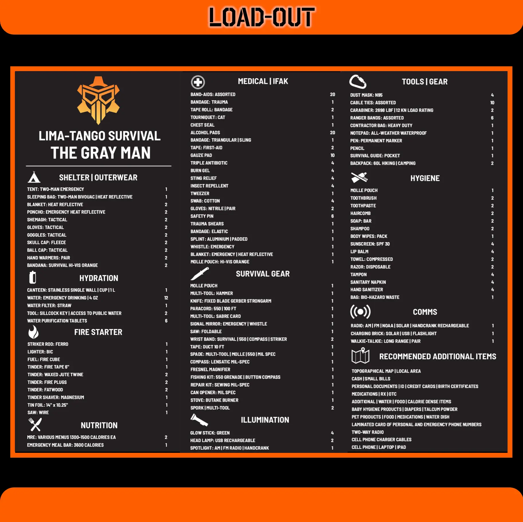 Customization: THE GRAY MAN is a versatile and comprehensive survival kit, but personalization is key. You are encouraged to add specific personal items like Rx medication, Rx glasses, and pre-filled water bottles.