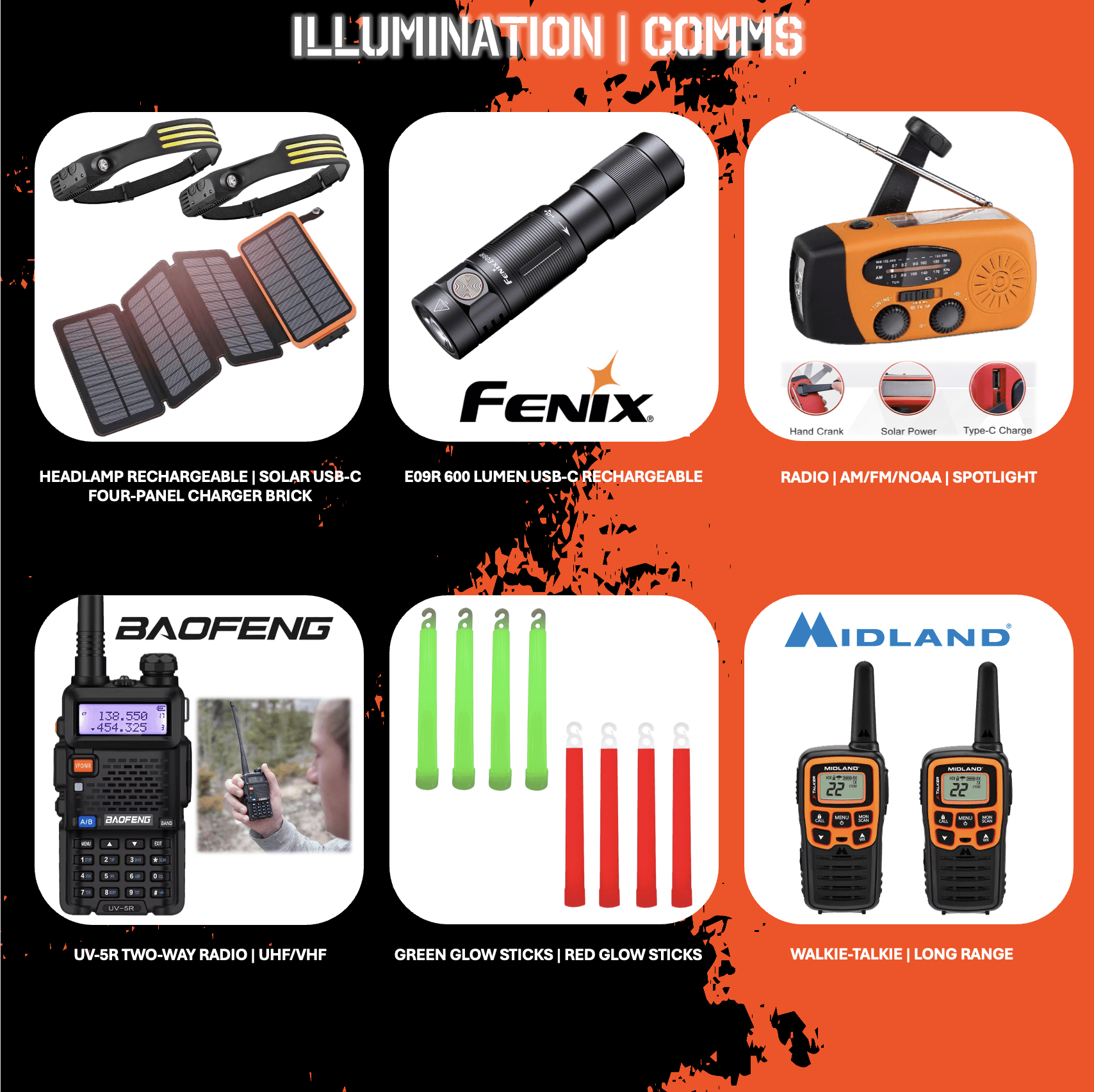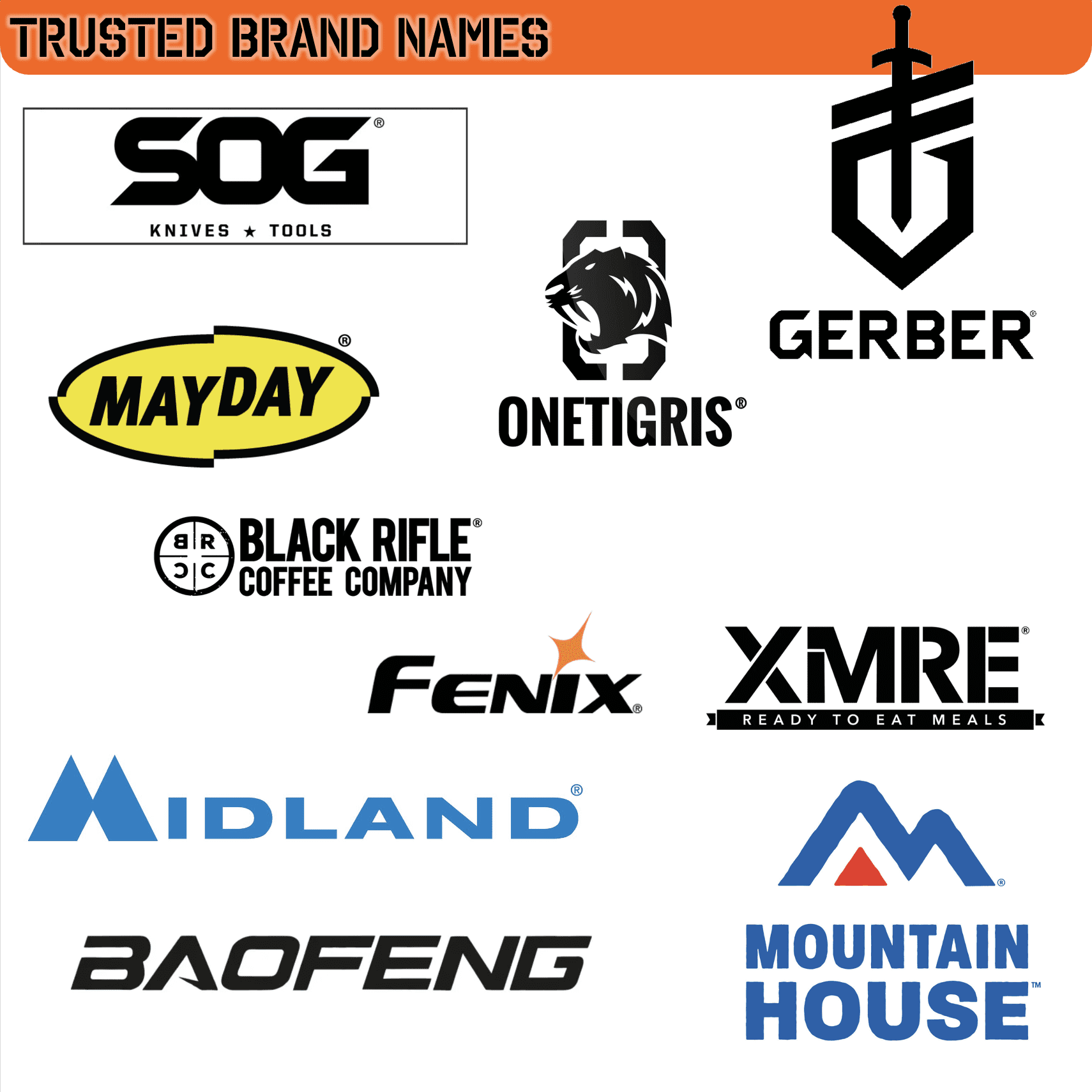 SOG, Fenix, OneTigris, Baofeng, XMRE and more name brands!