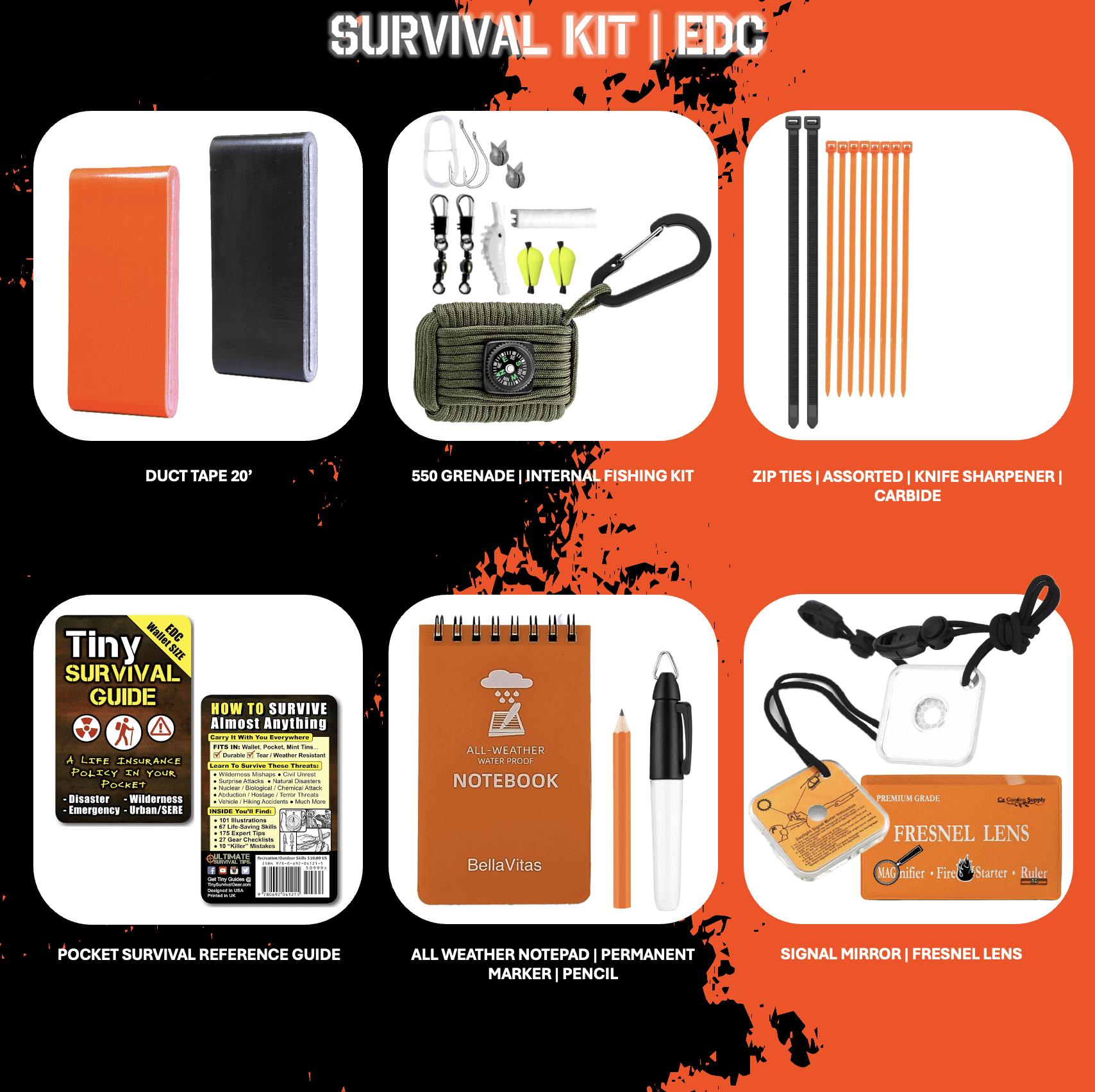 - 550 Cord Survival Grenade | Tinder | Button Compass | Eye Knife | Fishing Kit | Ferro Striker