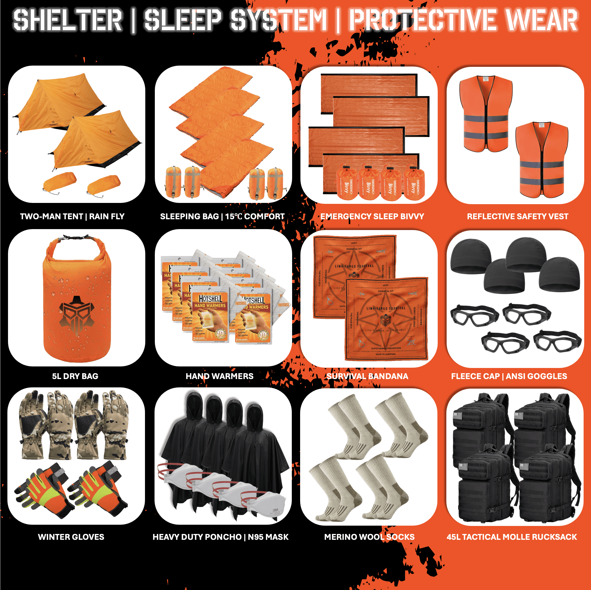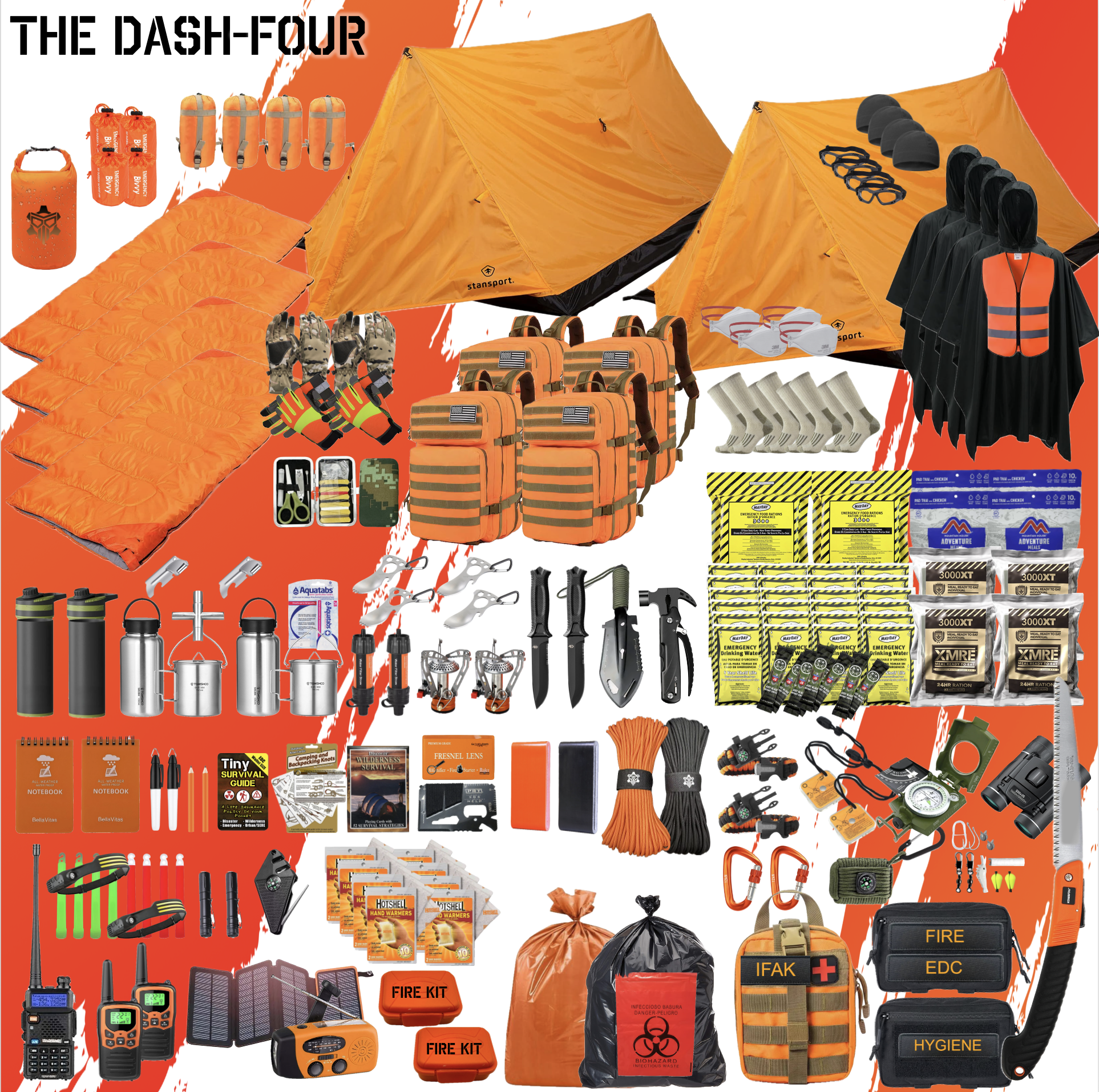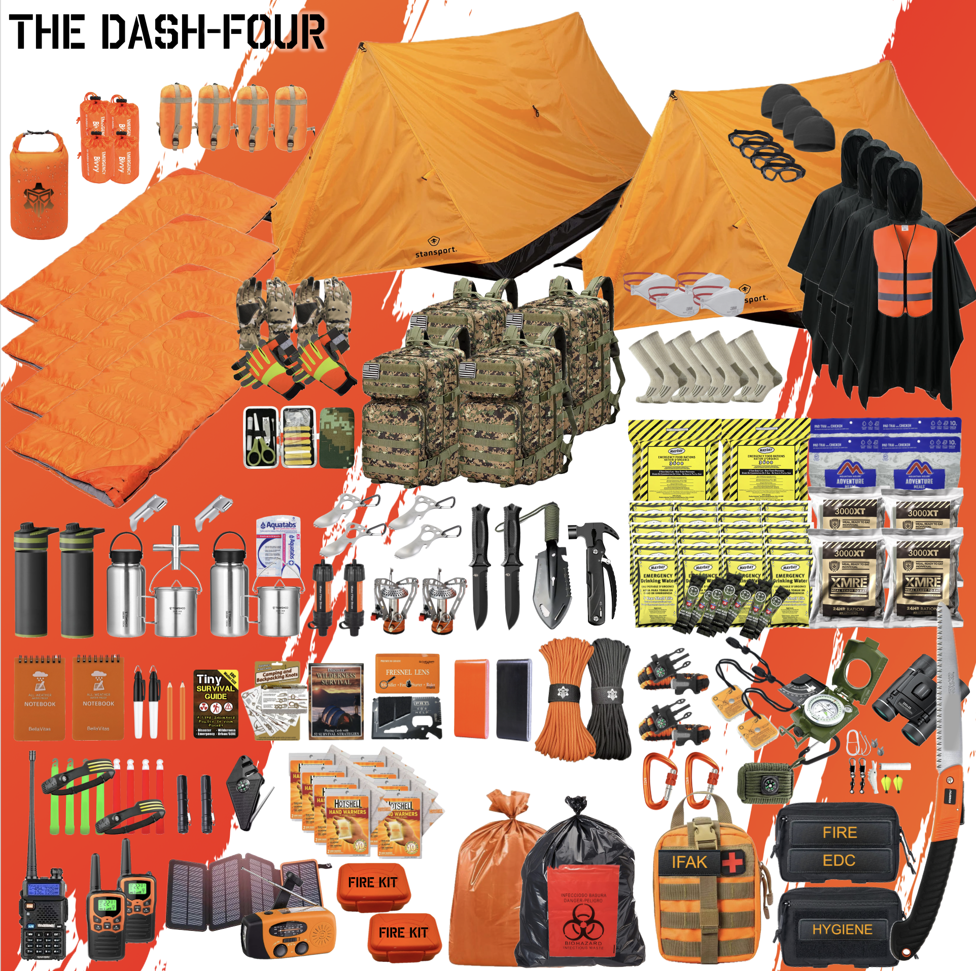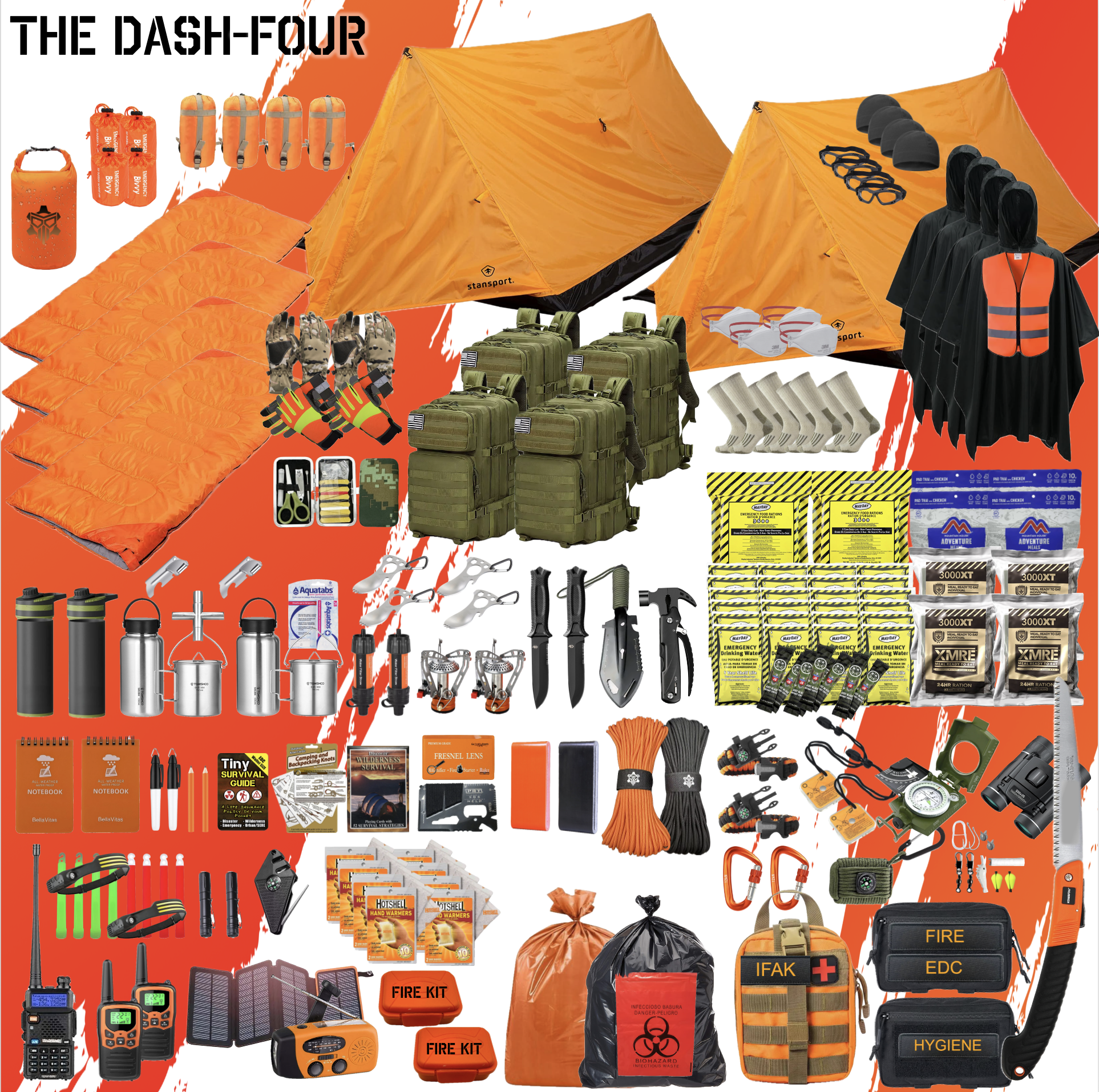 Introducing THE DASH-FOUR. This is the ultimate survival kit designed for a four-man team facing extreme conditions for 72+ hours. Whether it’s for SHTF scenarios, emergencies, or non-permissive environments, THE DASH-FOUR ensures you’re prepared for 72+ hours of survival with over 400 top-tier items.