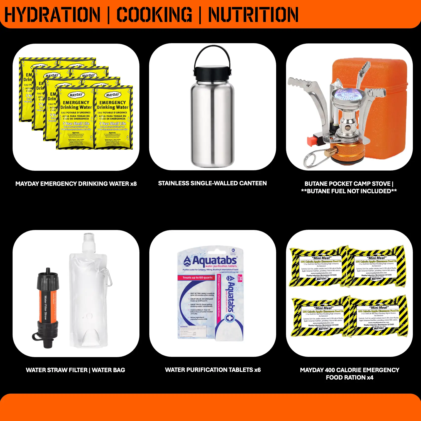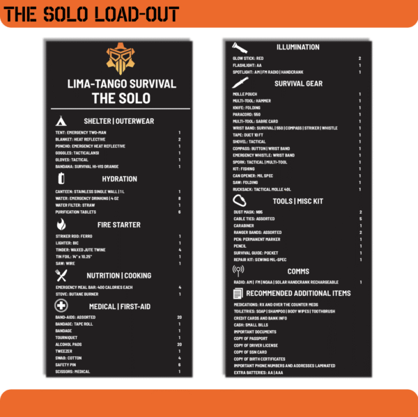 Customization: THE SOLO is a versatile and comprehensive survival kit, but personalization is key. You are encouraged to add specific personal items like Rx medication, Rx glasses, and pre-filled water bottles.